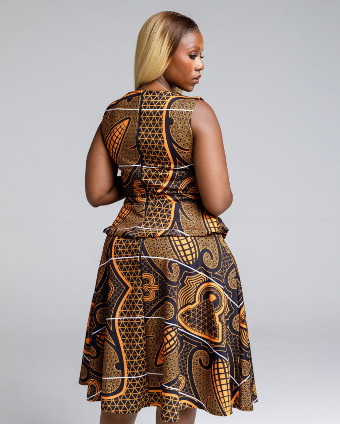 Mapoone Sleeveless-Top and Skirt (Charcoal, Gold & Orange) - Midi